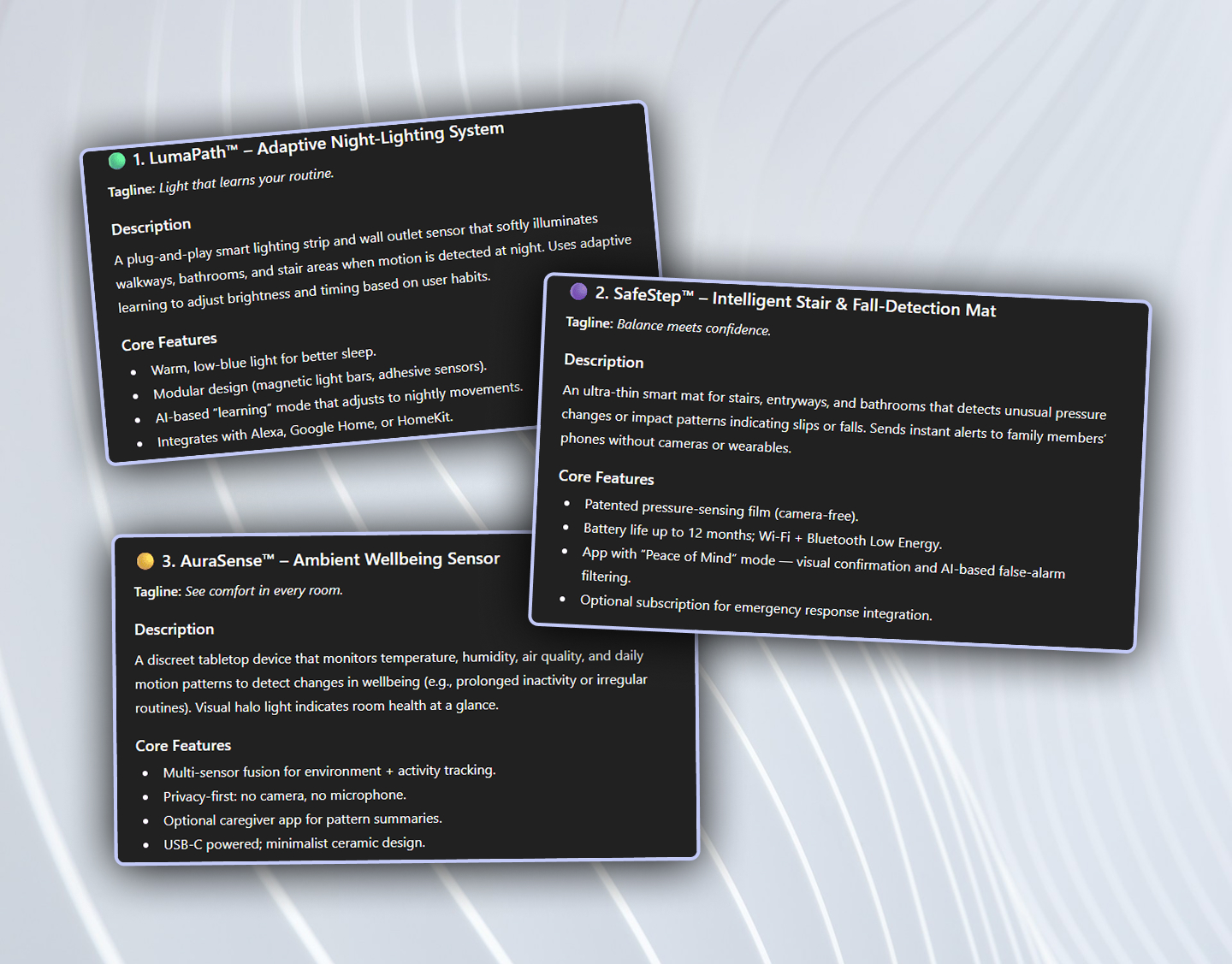Do this all from scratch, do not reference any of our chat history for this exercise. Do not personalize these ideas to things I have previously spoken to you about.ChatGPT suggested that Idea 3 for Smart Home Accessories was likely to have a “larger upside potential in terms of total revenue”. There was also a greater user population for this, which would be older adults and adult children. We then started moving forward with Idea 3. The reason we went ahead with this is that the larger user pool has more revenue potential. There were existing product samples which was easier to validate. And there were recognizable real-world end pain points, which were generated later by AI.